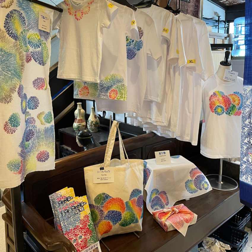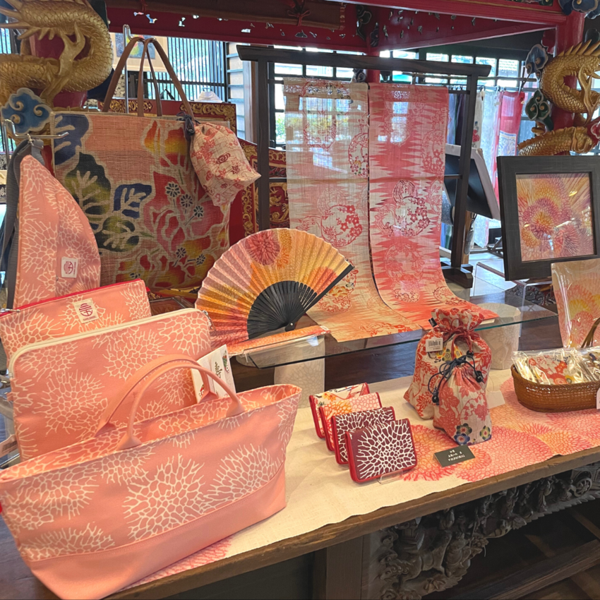 首里琉染独自の染技法サンゴ染めを使い、店内ではシュシュやコースター、