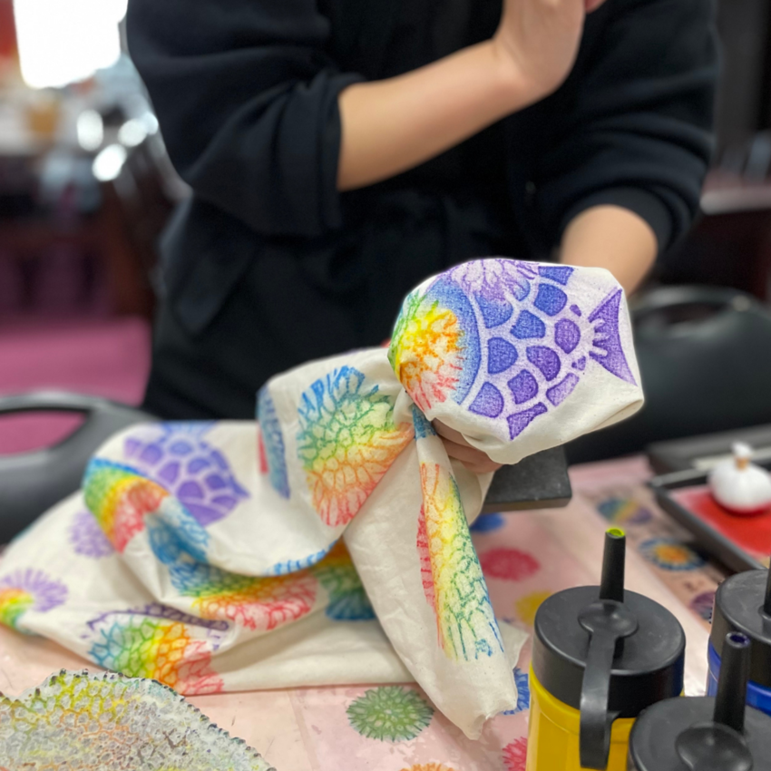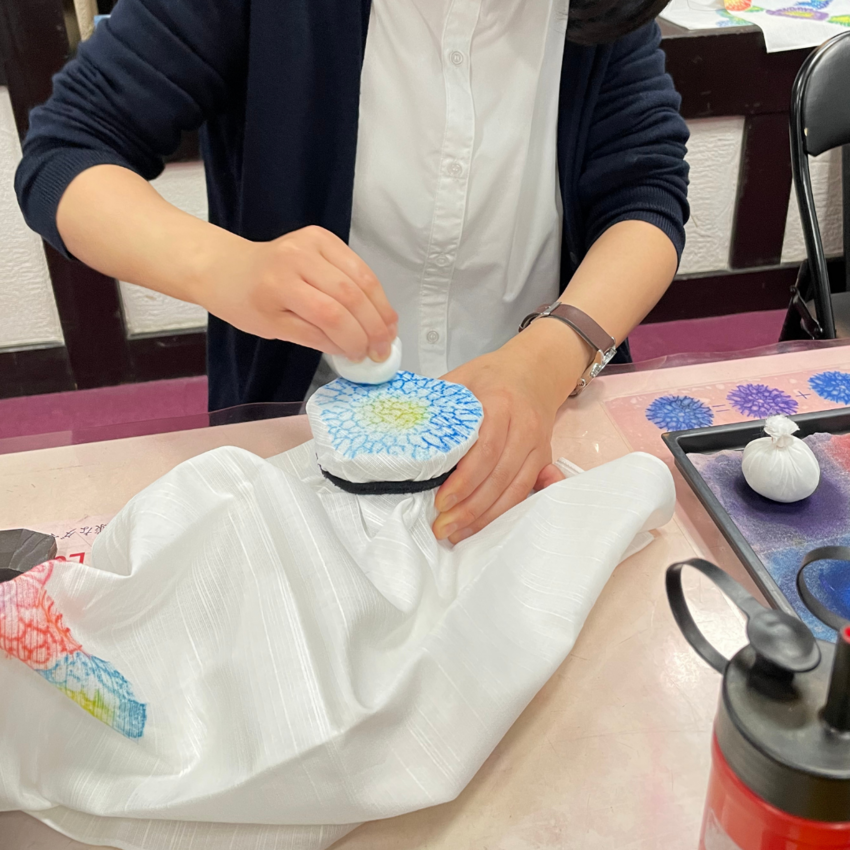 小さな巾着のようなタンポに染料をつけて好きな色をこすっていくと