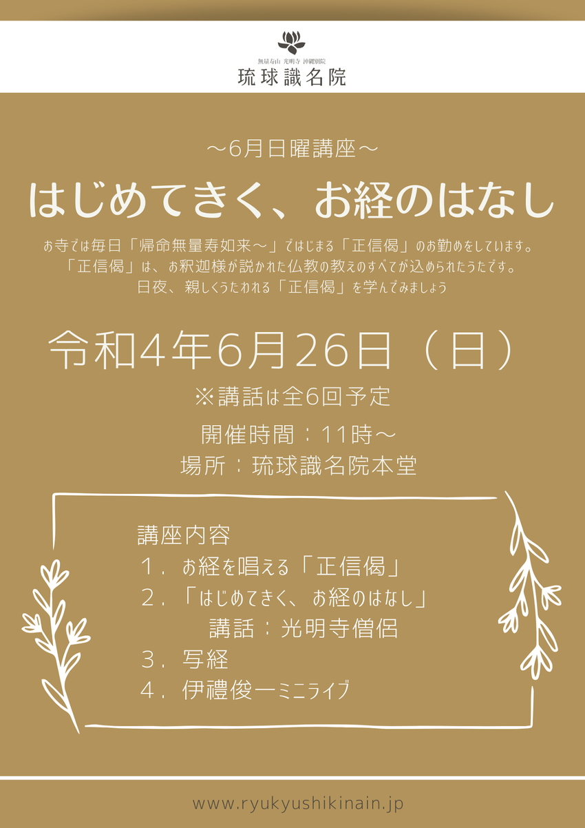 琉球識名院では、6月から日曜講座を開講いたします。