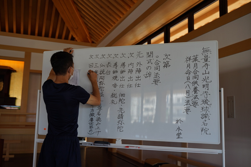 最初の写真は、定期法要の式次第を白板ボードに書き込んでいます。