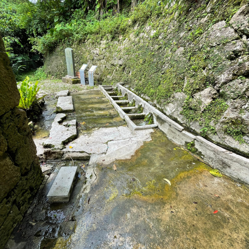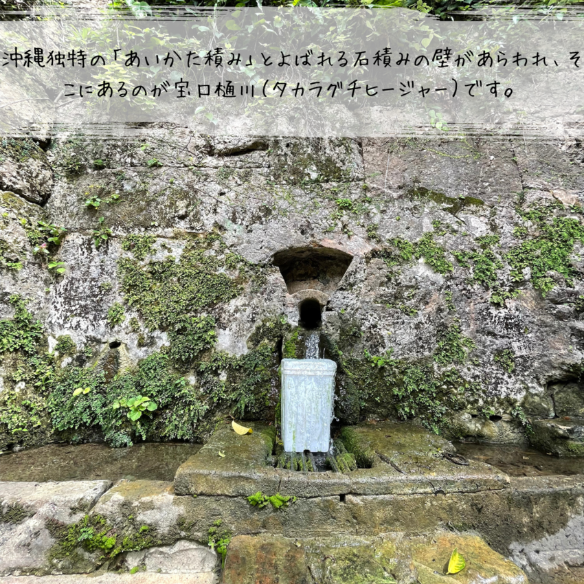 沖縄独特の「あいかた積み」とよばれる石積みの壁があらわれ、そこにあるのが宝口樋川(タカラグチヒージャー)です。今でも湧き出る水が静かに流れ、樋川の後ろには滝が流れています。