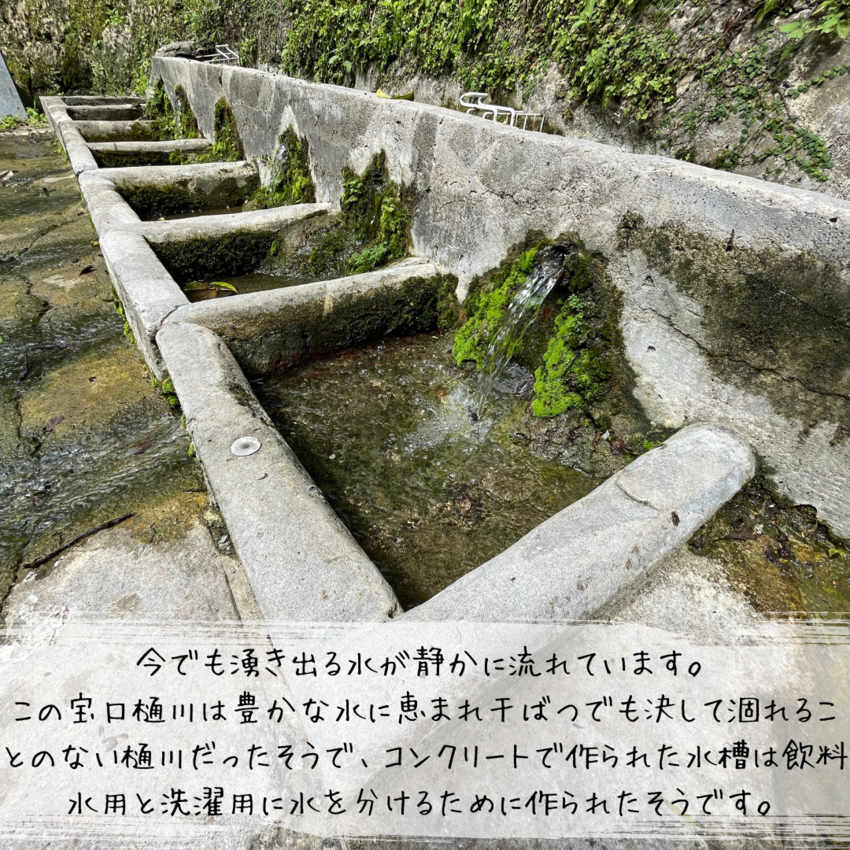 この宝口樋川は豊かな水に恵まれ干ばつでも決して涸れることのない樋川だったそうで、コンクリートで作られた水槽は飲料水用と洗濯用に水を分けるために作られたそうです。