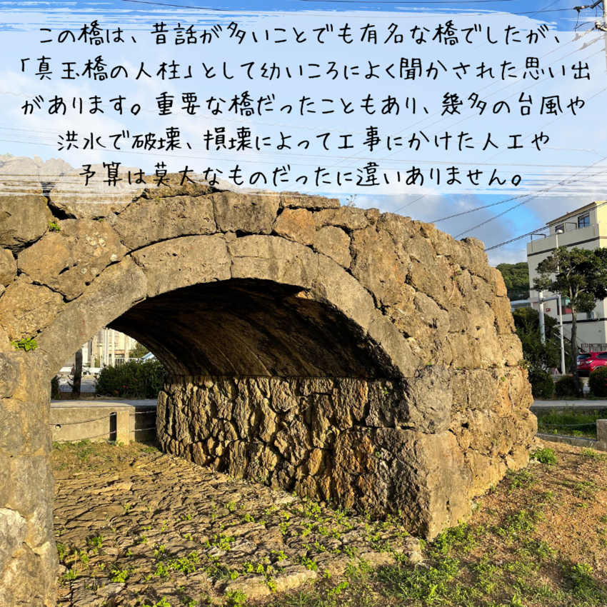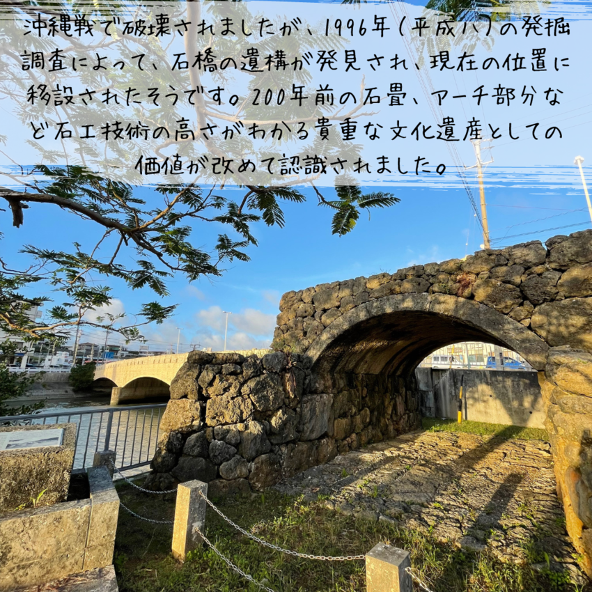 沖縄戦で破壊されましたが、1996年(平成八)の発掘調査によって、石橋の遺構が発見され、現在の位置に移設されたそうです。