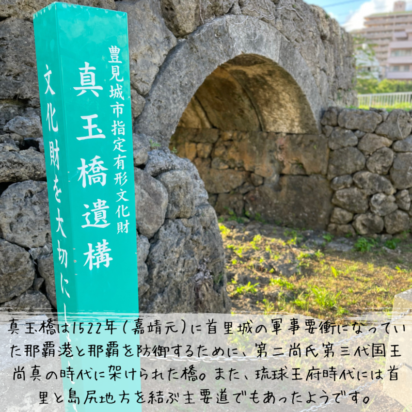 真玉橋は1522年(嘉靖元)に首里城の軍事要衝になっていた那覇港と那覇を防御するために、第二尚氏第三代国王尚真の時代に架けられた橋。