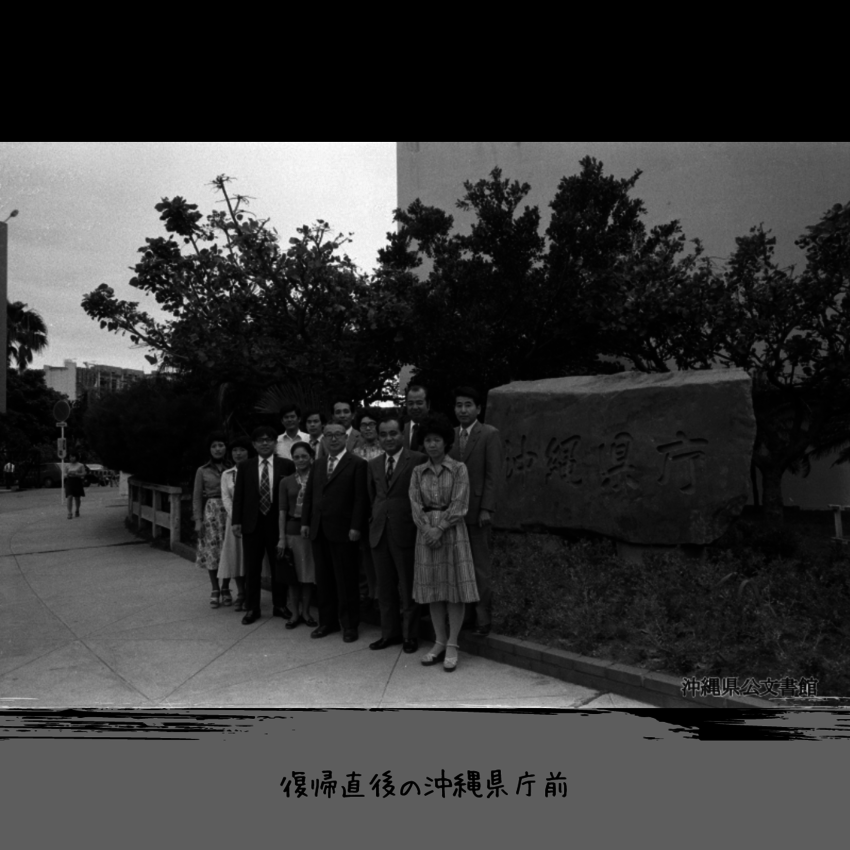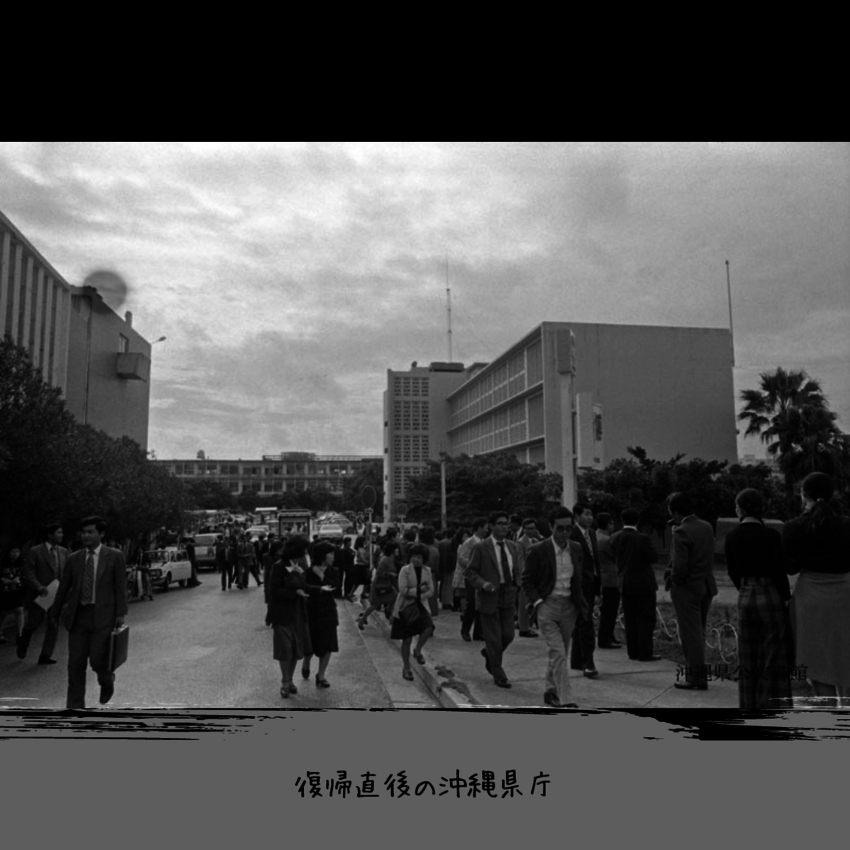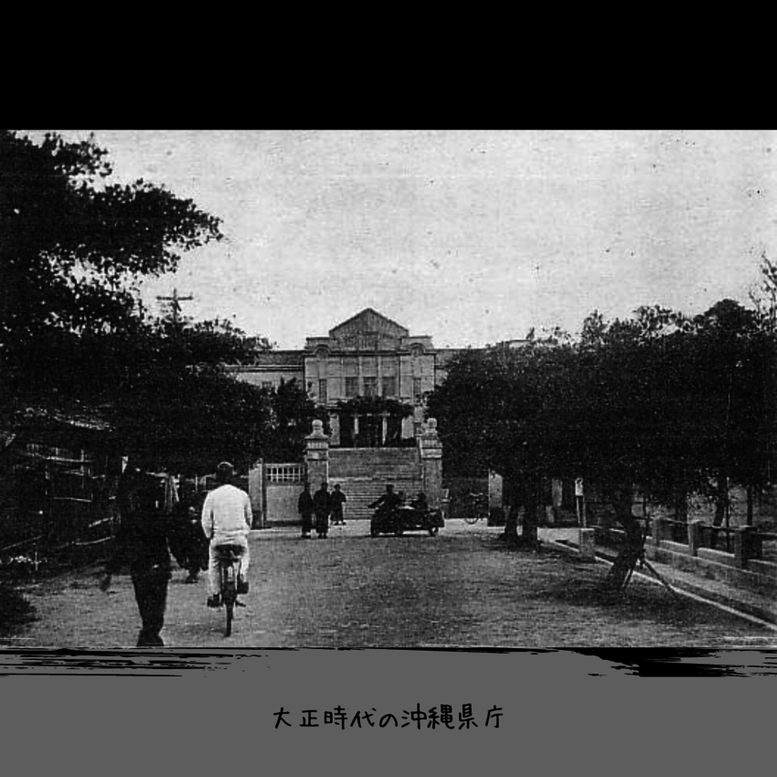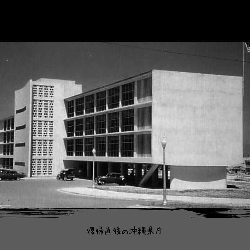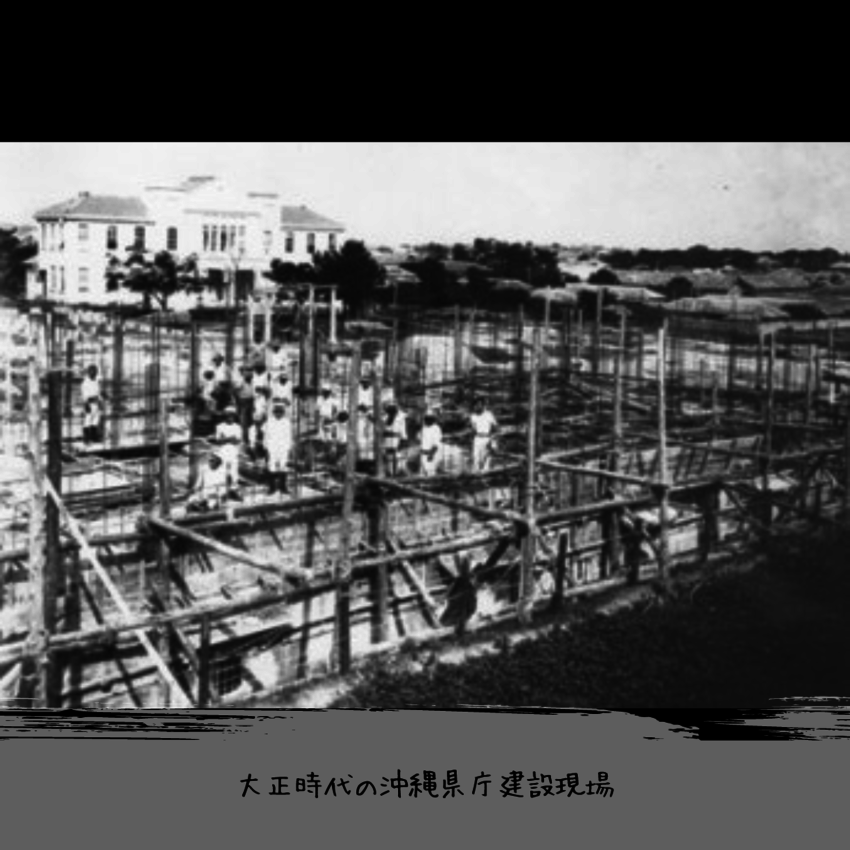 古い写真は、大正時代の沖縄県庁建築現場の様子と旧県庁、復帰直後の旧沖縄県庁の写真です。