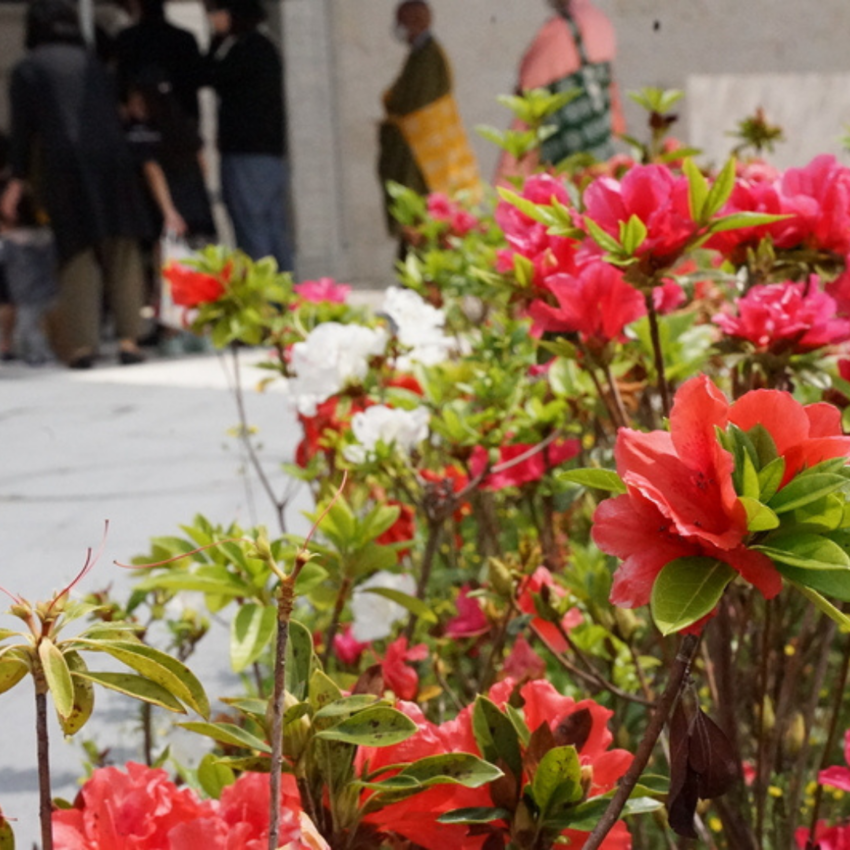 赤いつつじが彩る水盤は、素敵な彩を見せています。