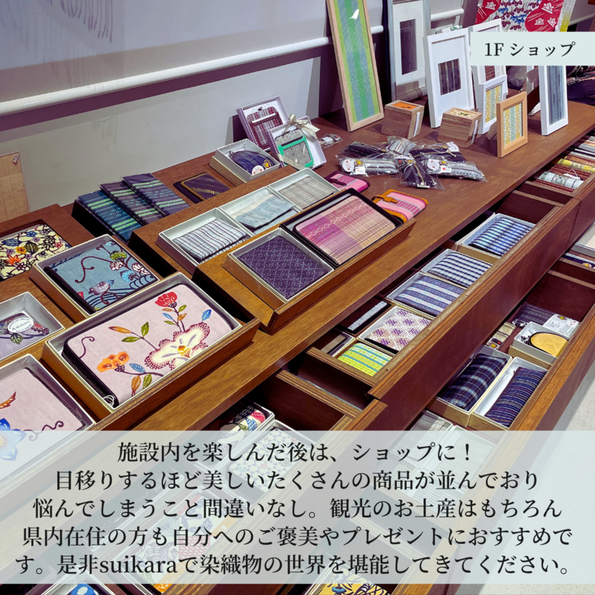 最後に1階に戻ってショップで実際に手に取ってみましょう!美しい染織物でできたアイテムたちが並んでおり自分へのプレゼントとして、贈り物としてもぴったりです。