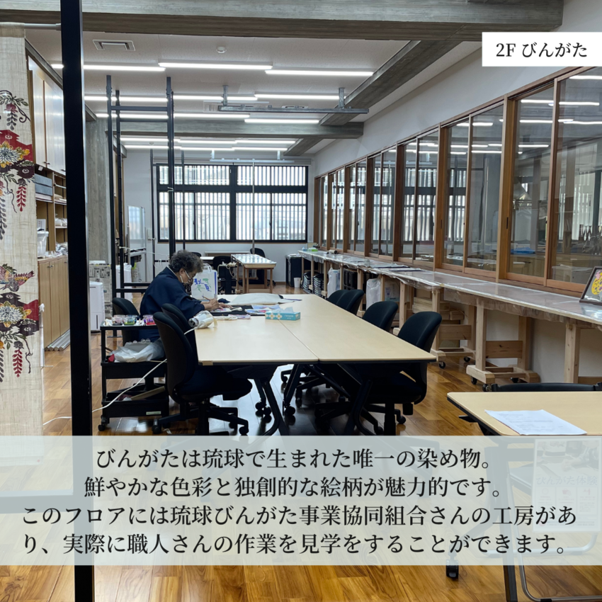 2階と3階は琉球びんがた事業協同組合さんと那覇伝統織物事業協同組合さんの工房があります。なんと作業の様子を自由に見学をすることが可能で、お伺いした日は実際に織り機に触れさせていただいたり、どのような工程で作られるのか作業スペースを拝見しながらわかりやすく説明していただくことができました。suikaraに訪れるまで知らなかったびんがたと織物の繊細な作業とその工程数に本当に驚きました。