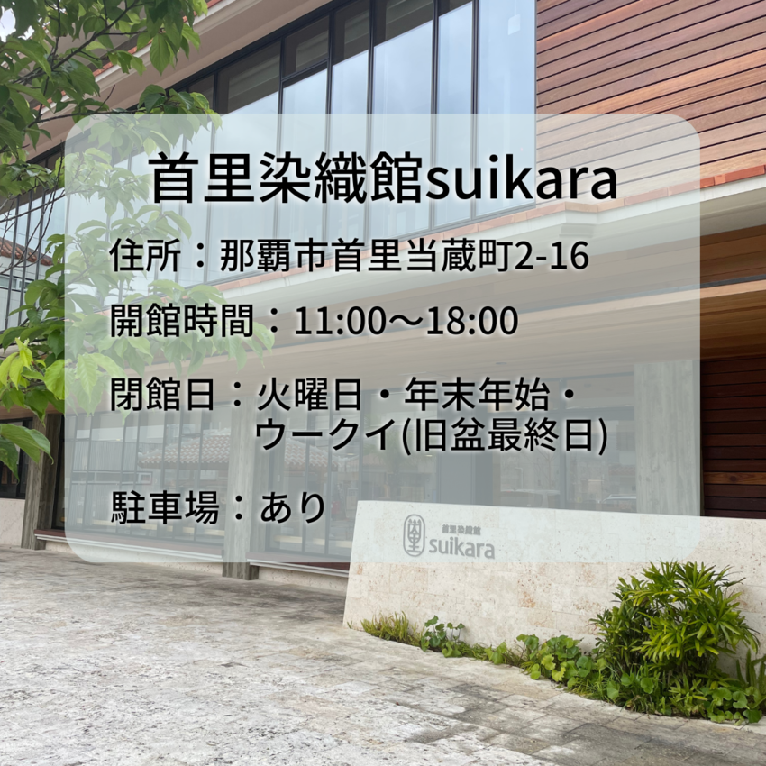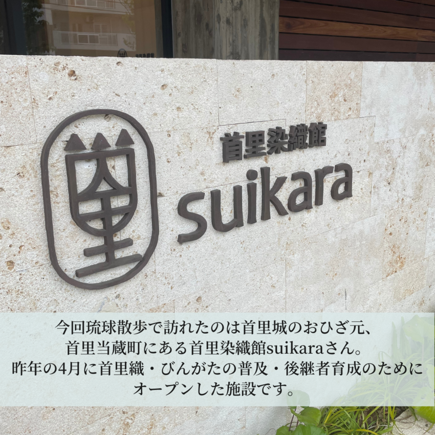 今回の琉球散歩は首里城のおひざ元、首里当蔵町にあるびんがた・首里織の普及・後継者育成のために昨年4月にオープンした「首里染織館 suikara」さんに伺ってきました。