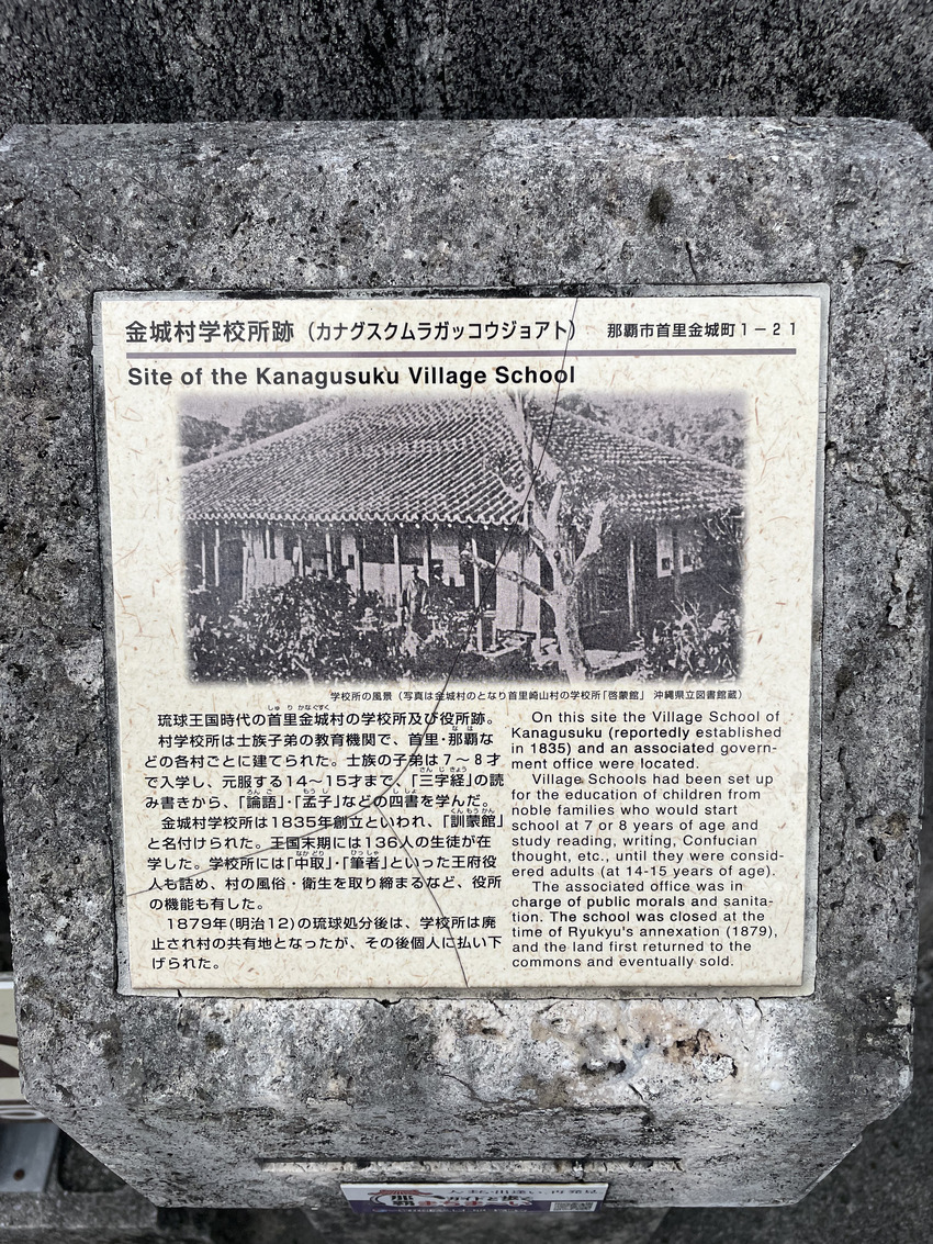 首里城から金城町石畳道を降りると金城村学校所跡の案内碑が立っています。