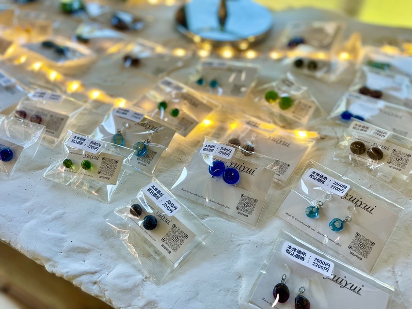 こちらは宙吹ガラス工房虹のガラスをとんぼ玉の技法でアクセサリーにされている結結さんのアクセサリー。美しくそしてとってもかわいい。