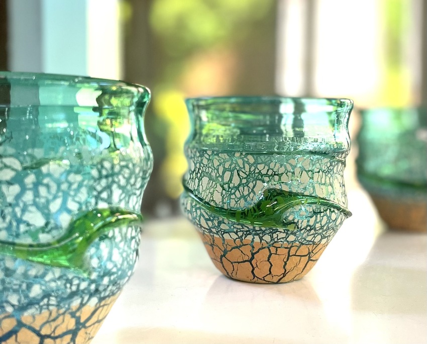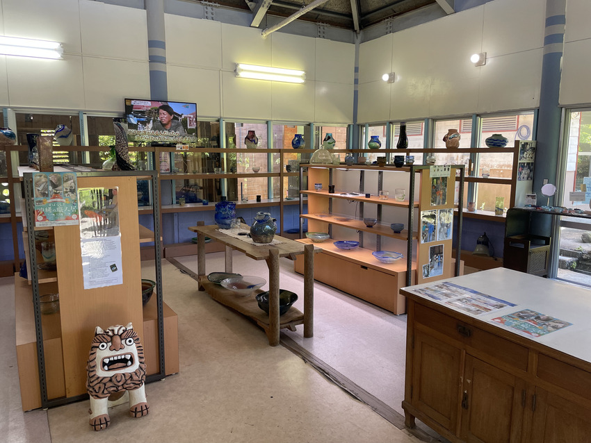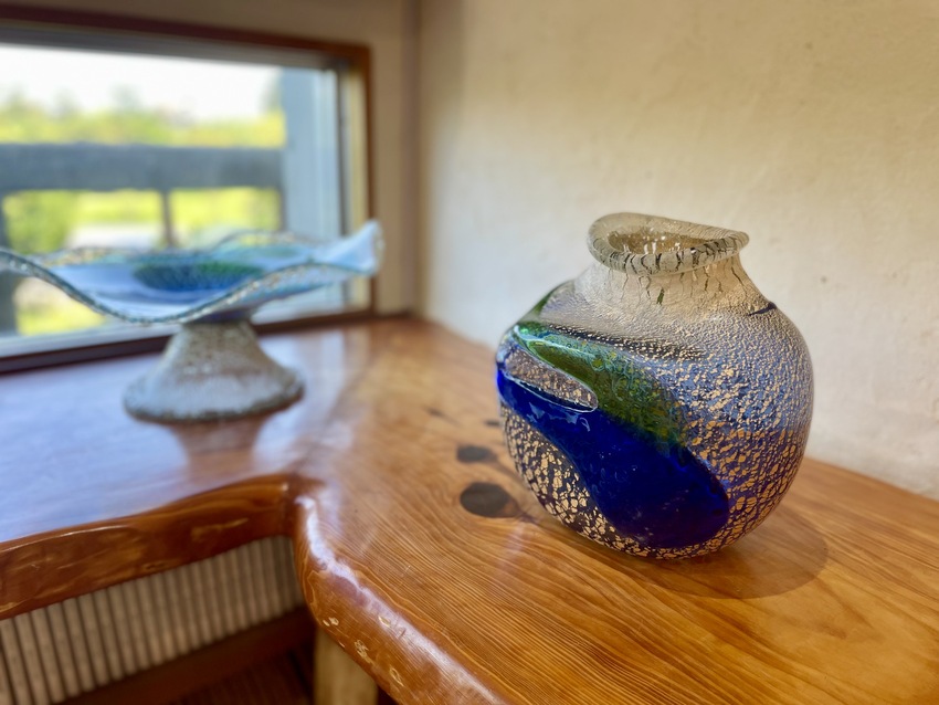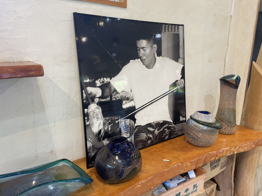 稲嶺盛吉氏・盛一郎氏の作品は廃瓶からガラスを作る際にでてしまう泡を逆手にとった「泡ガラス」だけでなく、珊瑚や黒糖など様々な素材を組み合わせて生み出す技法が特徴的で、実際に近くで拝見すると時にはやちむんとも取れるような表情豊かな作品ばかり。