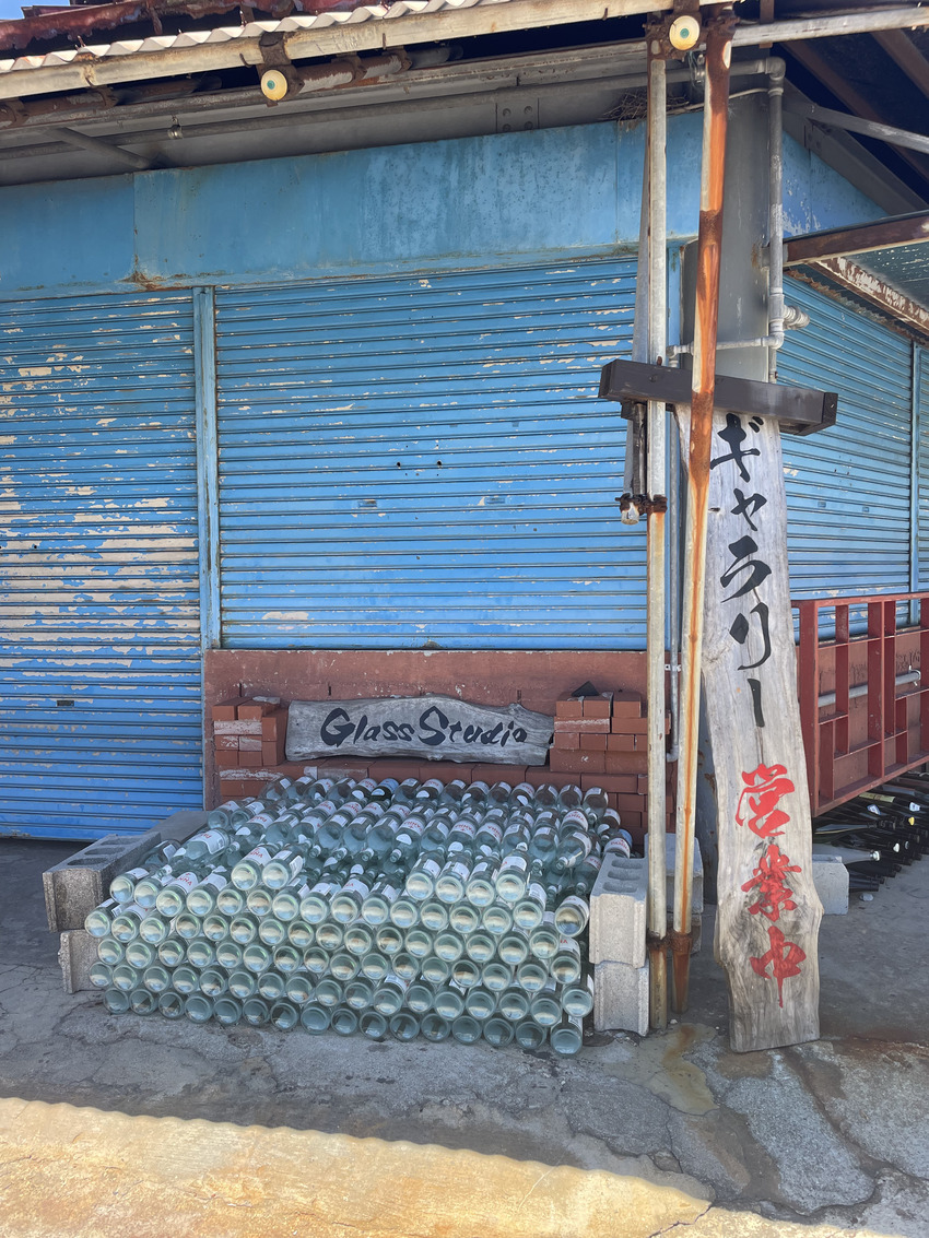 沖縄の伝統工芸品「琉球ガラス」は戦後、駐留米軍が飲んでいたコカ・コーラやビールなどの廃瓶からつくられたところから沖縄独自の琉球ガラスが生まれました。実際に敷地内にはたくさんの瓶が積まれていました。