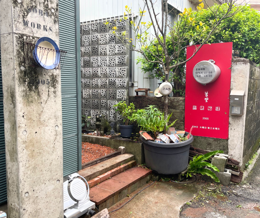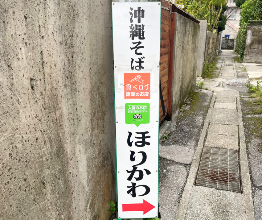 大通りから看板とのぼりを目印に筋道を進むと住宅街の中にあらわれる外観がかわいいお店、沖縄そば「首里ほりかわ」さんです。