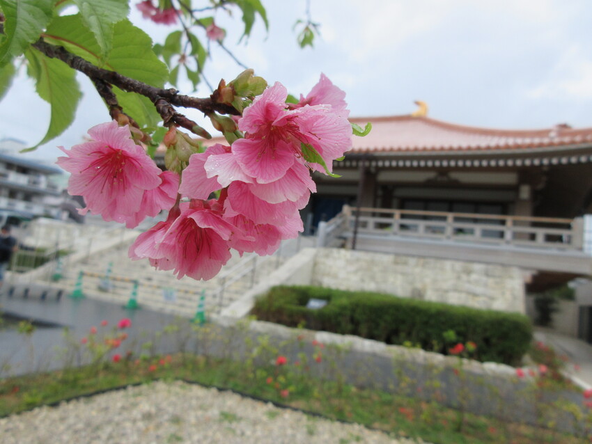 当寺院の境内水盤横に植えられているケラマツツジが色とりどりに咲いており、華やかな風景となっています。寒緋桜もそろそろ咲き終わりそうです。