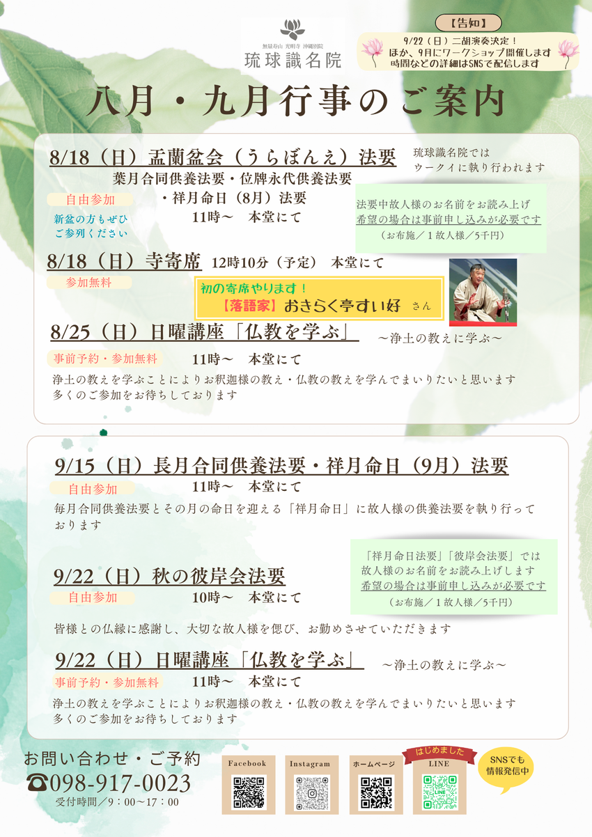 さて、八月・九月は以下の通り法要行事が予定されています。