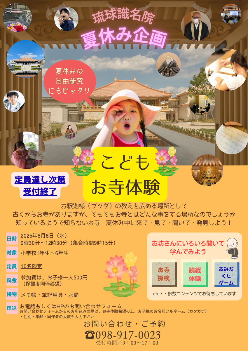 ☆夏休み企画☆こどもお寺体験!こんにちは 琉球識名院です。セミの鳴き声で真夏を感じる季節となりましたが、皆さまいかがお過ごしでしょうか?琉球識名院では、夏休みの特別企画として「こどもお寺体験」を行います。知っているようで知らないお寺の事を探検しながら見て・知って・体験する企画です。お坊さんにも質問できるこの企画夏休みの自由研究にもピッタリです。開催日2025年8月6日(水)☆10名の定員に達し次第受付終了になります。(残り僅か)ご参加お待ちしております。