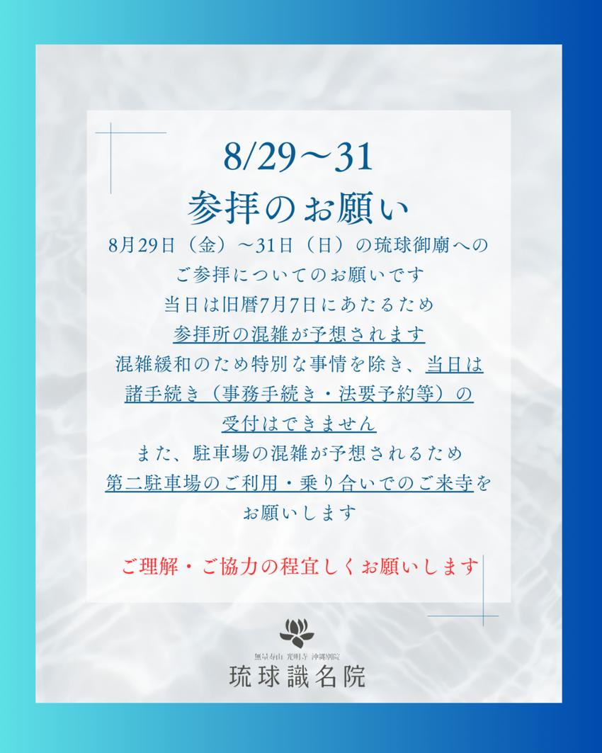 8/29(金)は旧暦7月7日にあたるため、参拝所の混雑が予想されます。
