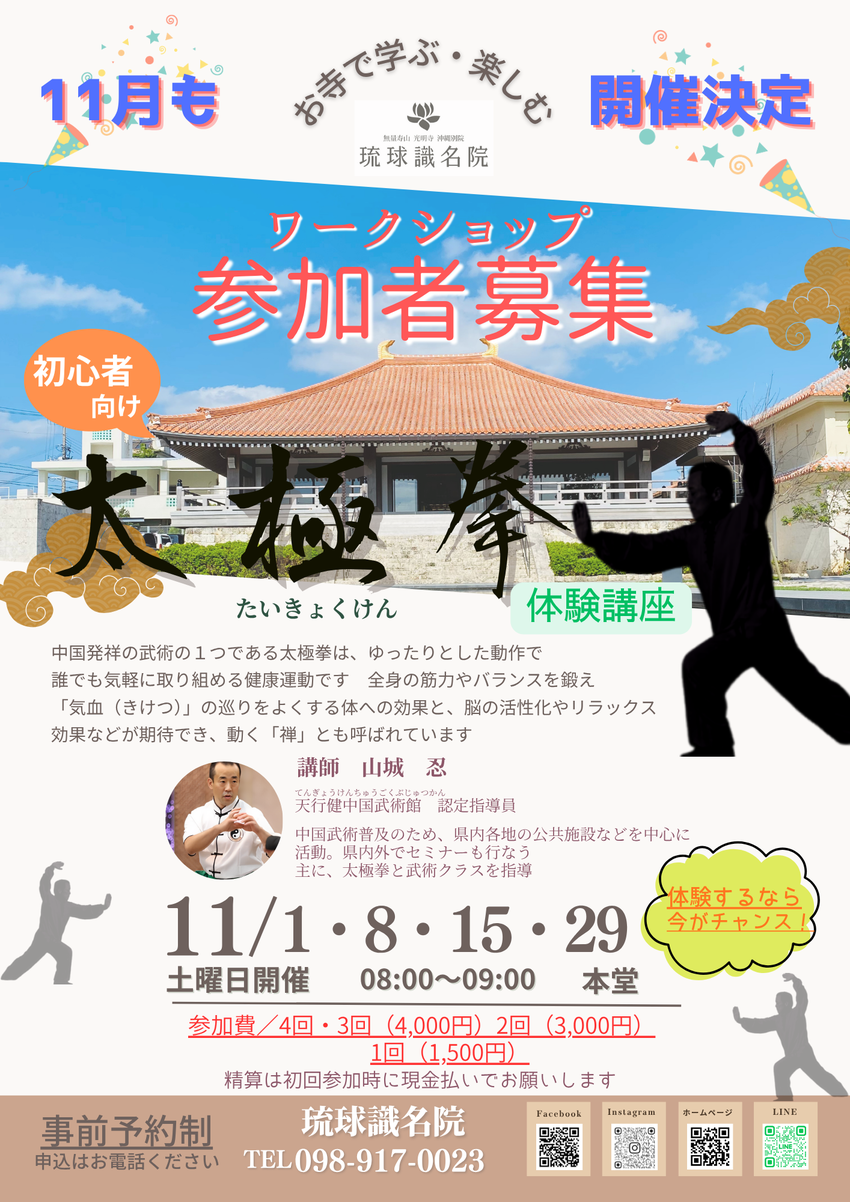 こんにちは、琉球識名院です。10月限定でご案内していた朝活太極拳ですが、参加者さんの希望により11月開催決定しました!!私を含め、まだまだガチガチの参加者ばかりのため、初体験の方も安心して参加できます。ぜひこの機会に参加しませんか?中国発祥の武術の1つである太極拳は、ゆったりとした動作で誰でも気軽に取り組める健康運動です 全身の筋力やバランスを鍛え、「気血(きけつ)」の巡りをよくする体への効果と、脳の活性化やリラックス効果などが期待でき、動く「禅」とも呼ばれています。太極拳の動きにはリラックス効果はもちろん♪□脚筋力の向上□バランス力の向上□全身持久力の向上が効果が期待できると言われています。やっと夏の暑さも和らぐ季節にお寺で朝活はじめてみませんか?土曜日企画はじめての太極拳体験講座【日時】11/1、11/8、11/15、11/29※11/22はありません朝の8時~9時【場所】琉球識名院 本堂【講師】天行健中国武術館 認定指導員山城 忍さん【参加費】4回・3回参加者 4,000円2回参加者 3,000円1回参加者 1,500円※支払いは当日現金払いになります。※初参加日にまとめ払いになります。予約方法/事前予約制のためお電話ください。琉球識名院 098-917-0023(9時⁻17時)みんな初心者なので、まだまだ体ガチガチですが楽しんで参加されてますぜひ、この機会にLet♪太極拳!!